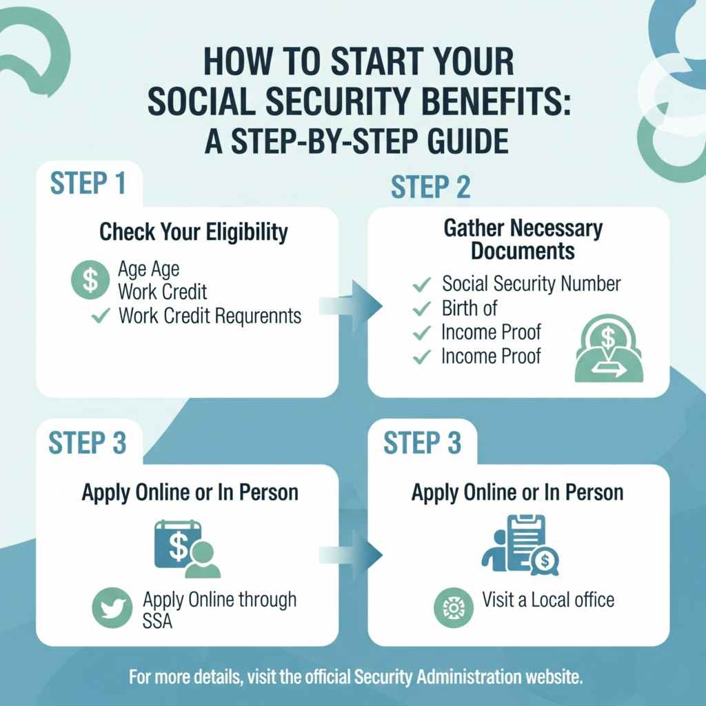 Starting your Social Security benefits is a straightforward process, but it’s important to prepare ahead of time. Follow these steps to apply: